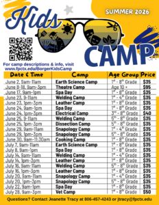 Most camps are available for 1st-8th grade students. The Kids Camps will continue through June and July. Pay attention to the days you register your child for camp as there are many different dates! Please check back for more information as we will continue to update this page as needed. For more information, contact Community Education Coordinator, Jeanette Tracy, at jtracy@fpctx.edu or 806-457-4243.